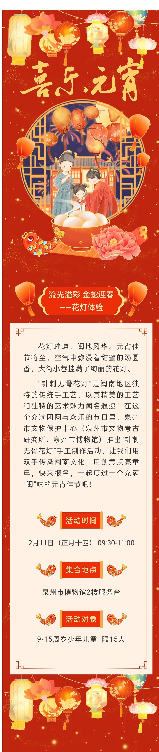 活动简介:“针刺无骨花灯”是闽南地区独特的传统手工艺,以其精美的工艺和独特的艺术魅力闻名遐迩!在这个充满团圆与欢乐的节日里,泉州市文物保护中心(泉州市文物考古研究所、泉州市博物馆)推出“针刺无骨花灯”手工制作活动,让我们用双手传承闽南文化,用创意点亮童年,快来报名,一起度过一个充满“闽”味的元宵佳节吧!