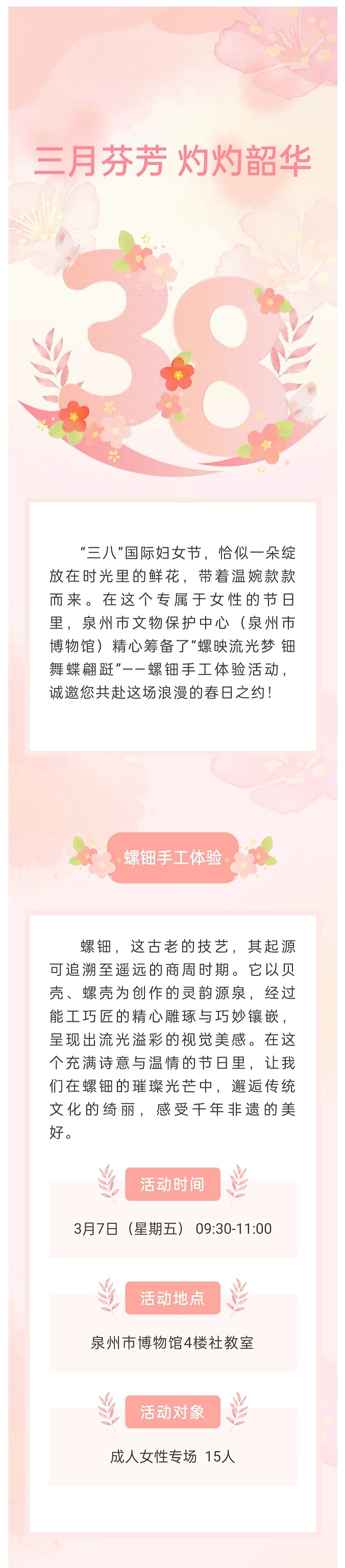 活动简介:“三八”国际妇女节,恰似一朵绽放在时光里的鲜花,带着温婉款款而来。在这个专属于女性的节日里,泉州市文物保护中心(泉州市博物馆)精心筹备了“螺映流光梦 钿舞蝶翩跹”——螺钿手工体验活动,诚邀您共赴这场浪漫的春日之约!