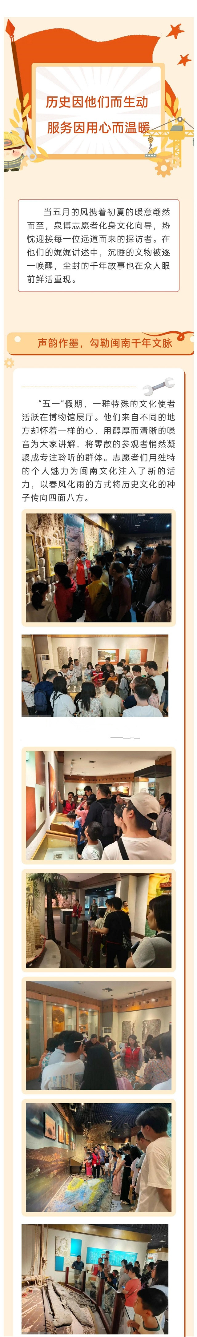 活动简介:当五月的风携着初夏的暖意翩然而至,泉博志愿者化身文化向导,热忱迎接每一位远道而来的探访者。在他们的娓娓讲述中,沉睡的文物被逐一唤醒,尘封的千年故事也在众人眼前鲜活重现。