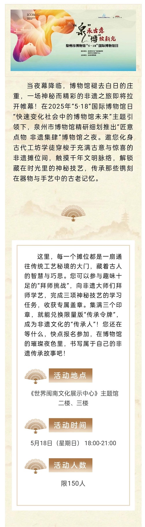 活动简介:在2025年“5·18”国际博物馆日“快速变化社会中的博物馆未来”主题引领下,泉州市博物馆精研细划推出“匠意点物 非遗集肆”博物馆之夜。邀您化身古代工坊学徒穿梭于充满古意与惊喜的非遗摊位间,触摸千年文明脉络,解锁藏在时光里的神秘技艺,传承那些镌刻在器物与手艺中的古老记忆。