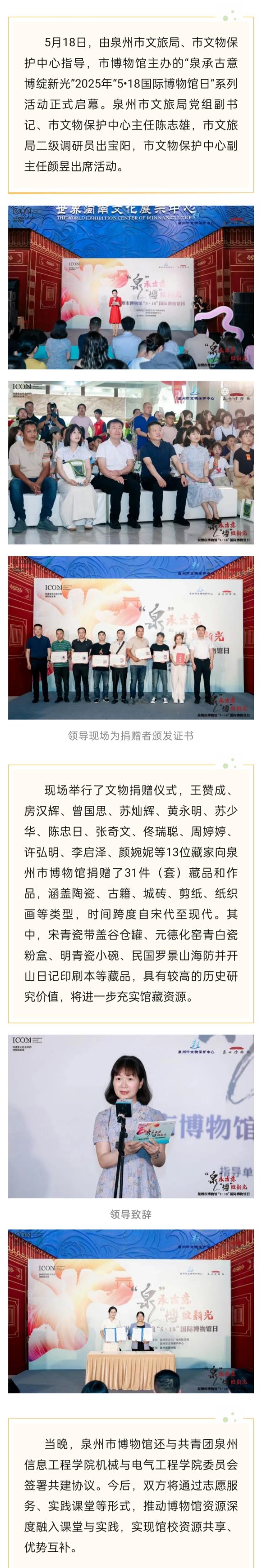 活动简介:5月18日,由泉州市文旅局、市文物保护中心指导,市博物馆主办的“泉承古意 博绽新光”2025年“5•18国际博物馆日”系列活动正式启幕。