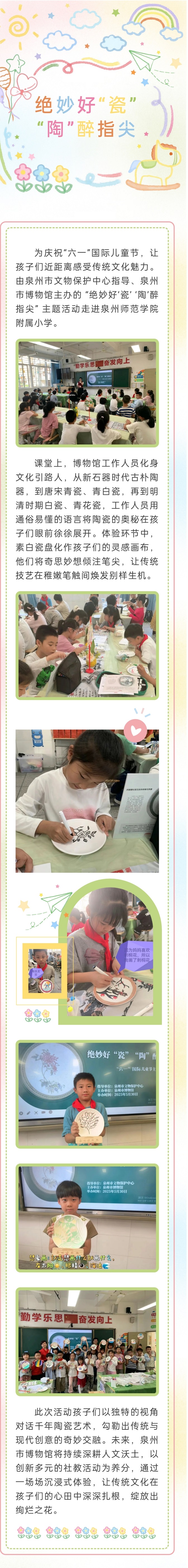 活动简介:为庆祝“六一”国际儿童节,让孩子们近距离感受传统文化魅力。由泉州市文物保护中心指导、泉州市博物馆主办的 “绝妙好‘瓷’ ‘陶’醉指尖” 主题活动走进泉州师范学院附属小学。